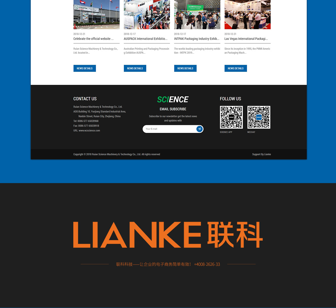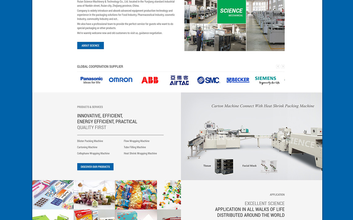 RUIAN SCIENCE MACHINERY & TECHNOLOGY CO., LTD. LOCATED IN THE YUNJIANG STANDARD INDUSTRIAL AREA OF NANBIN STREET, RUIAN CITY, ZHEJIANG PROVINCE, CHINA.COMPANY IS WIDELY INTRODUCE AND ABSORB ADVANCED EQUIPMENT PRODUCTION TECHNOLOGY AND EXPERIENCE IN THE PACKAGING SOLUTIONS FOR FOOD INDUSTRY, PHARMACEUTICAL INDUSTRY, COSMETIC INDUSTRY, COMMODITY INDUSTRY AND ECT..
