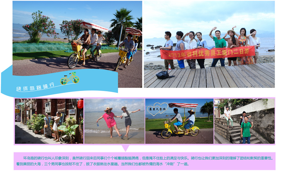 2013年6月22日,為了給員工創(chuàng)造一個放松機會,我公司后勤部全體工作人員和部分技術(shù)部工作人員前往世界聞名的"海上花園"城市廈門體驗夏季休閑之旅。本次旅游活動主要有以下幾個環(huán)節(jié),它們分別是品嘗廈門特色小吃,繞環(huán)島路騎行,體驗海風(fēng)及海水的清涼,乘坐輪渡享受海風(fēng),欣賞鼓浪嶼的百國建筑群,品味廈門休閑生活的節(jié)奏。22日中午,我們抵達廈門,按照原本的計劃逐一體驗。