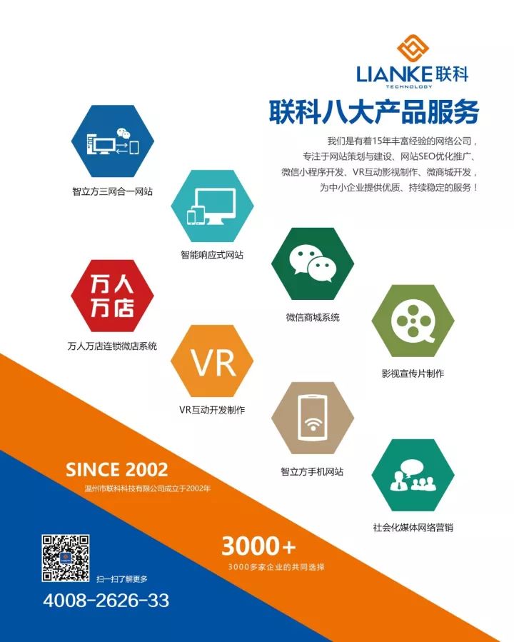 溫州市聯(lián)科科技有限公司成立于2002年,從業(yè)15年以來專注于互聯(lián)網(wǎng)技術(shù)服務(wù),為廣大中小微企業(yè)提供互聯(lián)網(wǎng)基礎(chǔ)服務(wù)。時代在不斷變化,新技術(shù)窮出不盡,做為一家互聯(lián)網(wǎng)第三方技術(shù)服務(wù)公司,聯(lián)科科技一直把技術(shù)創(chuàng)新做為公司發(fā)展的重要任務(wù)去抓,不斷推出適應(yīng)企業(yè)發(fā)展的新技術(shù)、新產(chǎn)品、新服務(wù)。