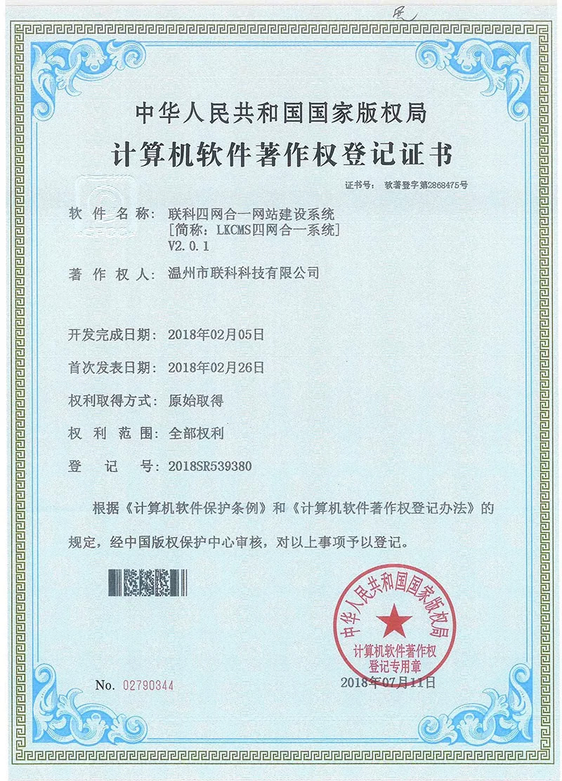 《聯科四網合一網站建設系統(tǒng)V2.0.1》于2018年07月11日被正式授予《中華人民共和國國家版權局計算機軟件著作權登記證書》,登記號為2018SR539380。