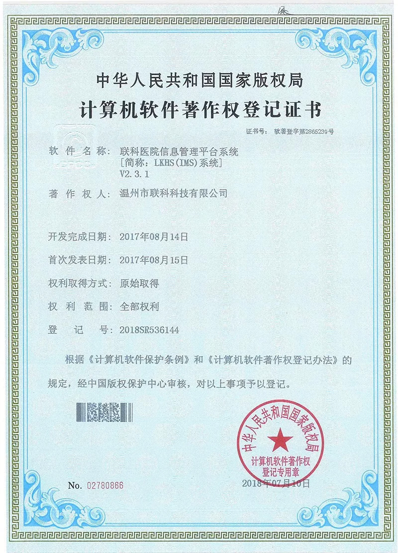 《聯科醫(yī)院信息管理平臺系統(tǒng)V2.3.1》于2018年07月10日被正式授予《中華人民共和國國家版權局計算機軟件著作權登記證書》,登記號為2018SR536144。