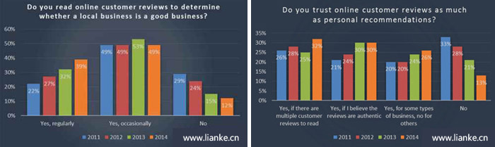 圖1:88%的人閱讀評(píng)論來確定本地業(yè)務(wù)的質(zhì)量(左)&88%的消費(fèi)者表示相信在線評(píng)論的個(gè)人推薦(右)