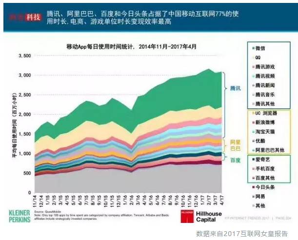 據(jù)2017互聯(lián)網(wǎng)女皇報(bào)告稱(chēng),中國(guó)用戶平均每天投入到移動(dòng)應(yīng)用的時(shí)間為大約31億小時(shí),投入到微信的時(shí)間約為9億小時(shí)。QQ、百度的愛(ài)奇藝、阿里巴巴的UC瀏覽器和微博等移動(dòng)應(yīng)用的使用時(shí)間均排在微信之后。