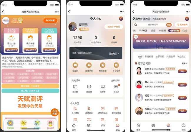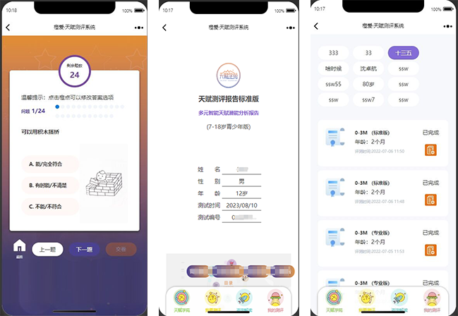 橙愛測評系統(tǒng)用到的八大智能數(shù)據(jù)、測評試卷、測評題目、測評結果數(shù)據(jù)、測評報告數(shù)據(jù)、測評報告訂單、訪問日志、報告解鎖碼和預約用戶等內容進行管理。系統(tǒng)支持多用戶多年齡段的測評,根據(jù)用戶端測試結果進行數(shù)據(jù)處理,從而形成測評對象的專業(yè)測評報告,傳輸給前端用戶查閱。
